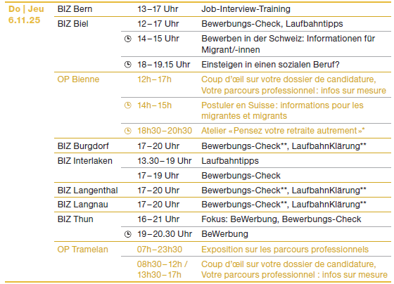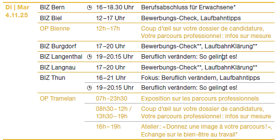Unsere Fachpersonen freuen sich, Sie bei Fragen rund um Ihren Berufsweg zu unterstützen. In Workshops erarbeiten Sie praktische Anwendungstipps, in Interview-Trainings üben Sie Bewerbungssituationen, und in kurzen Beratungsgesprächen klären wir Ihre Fragen zu Ihrer persönlichen Laufbahn.